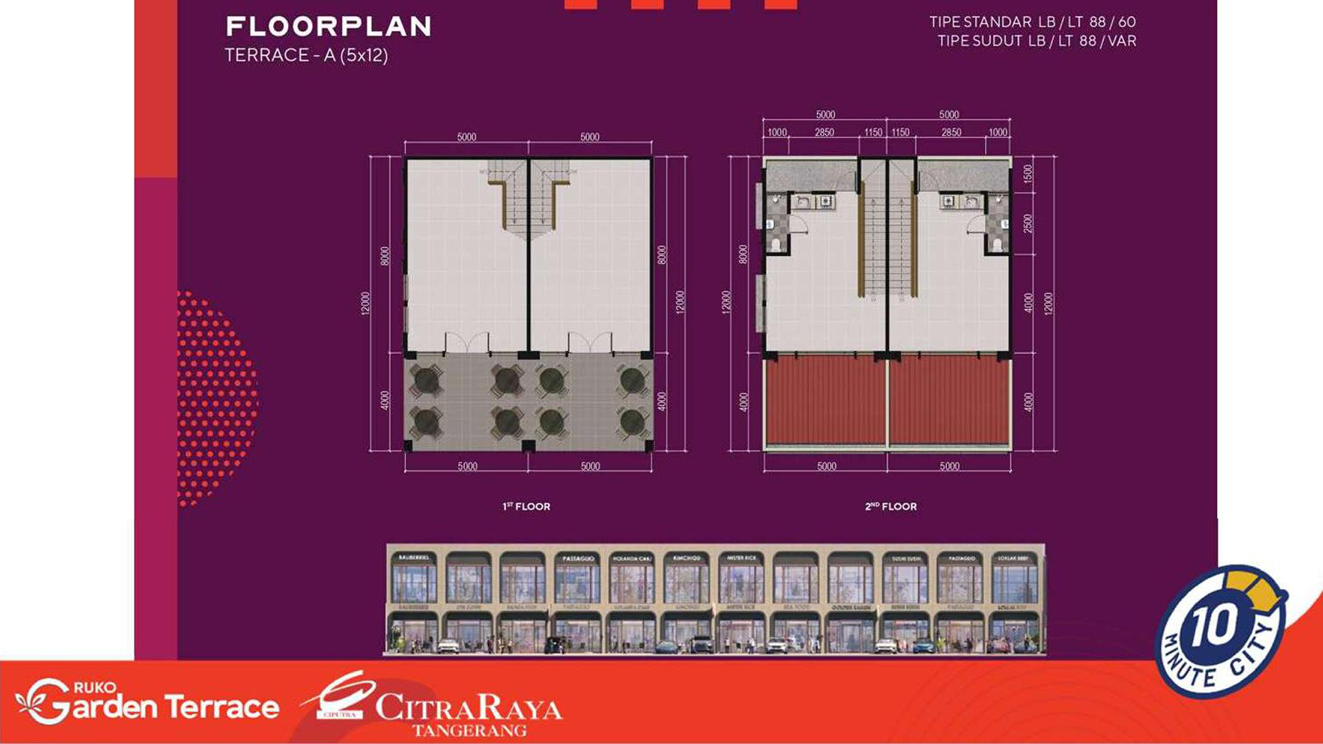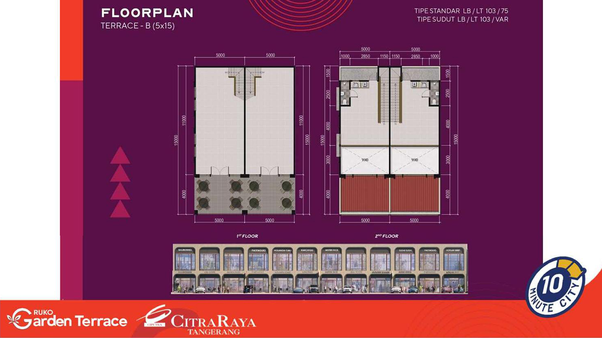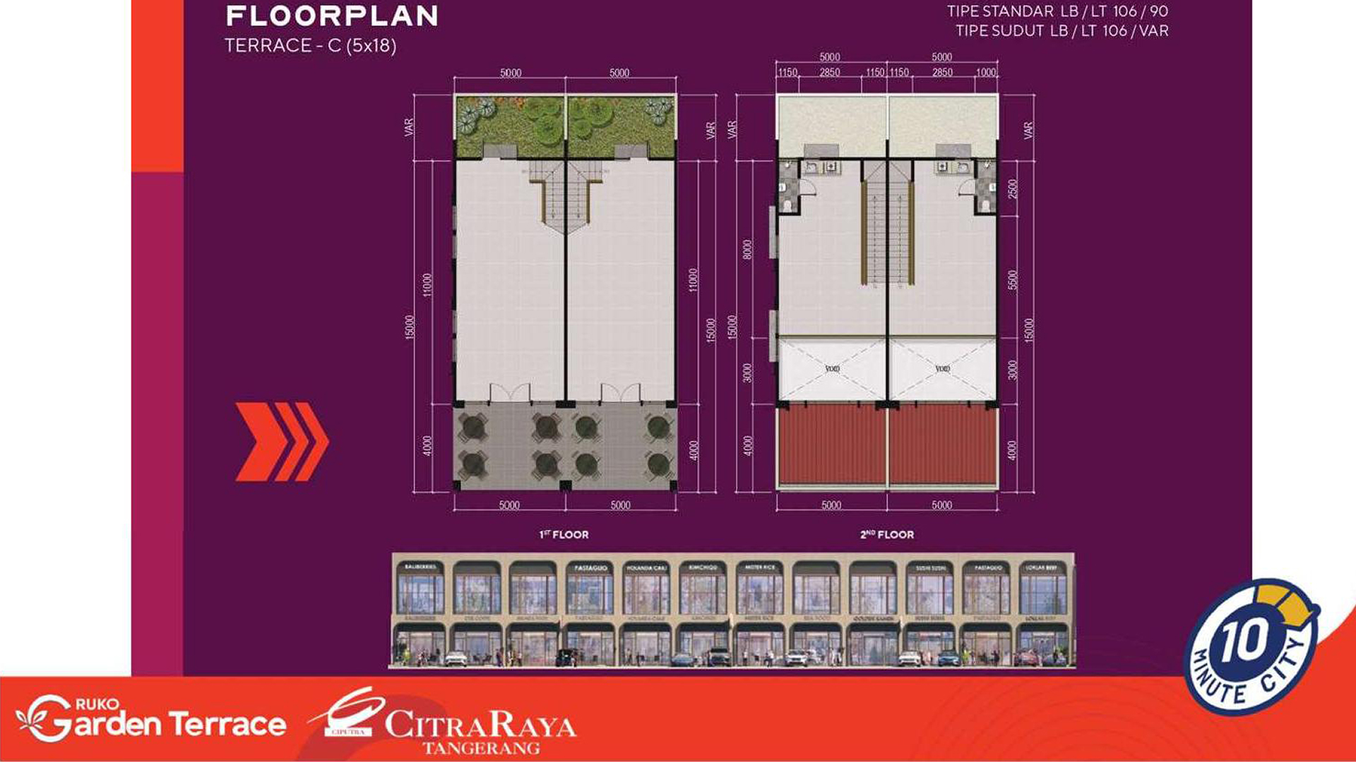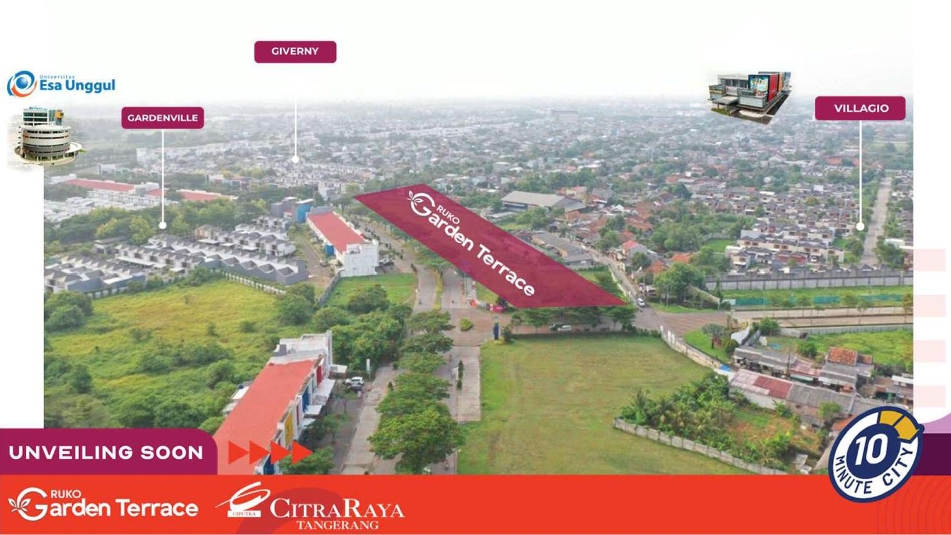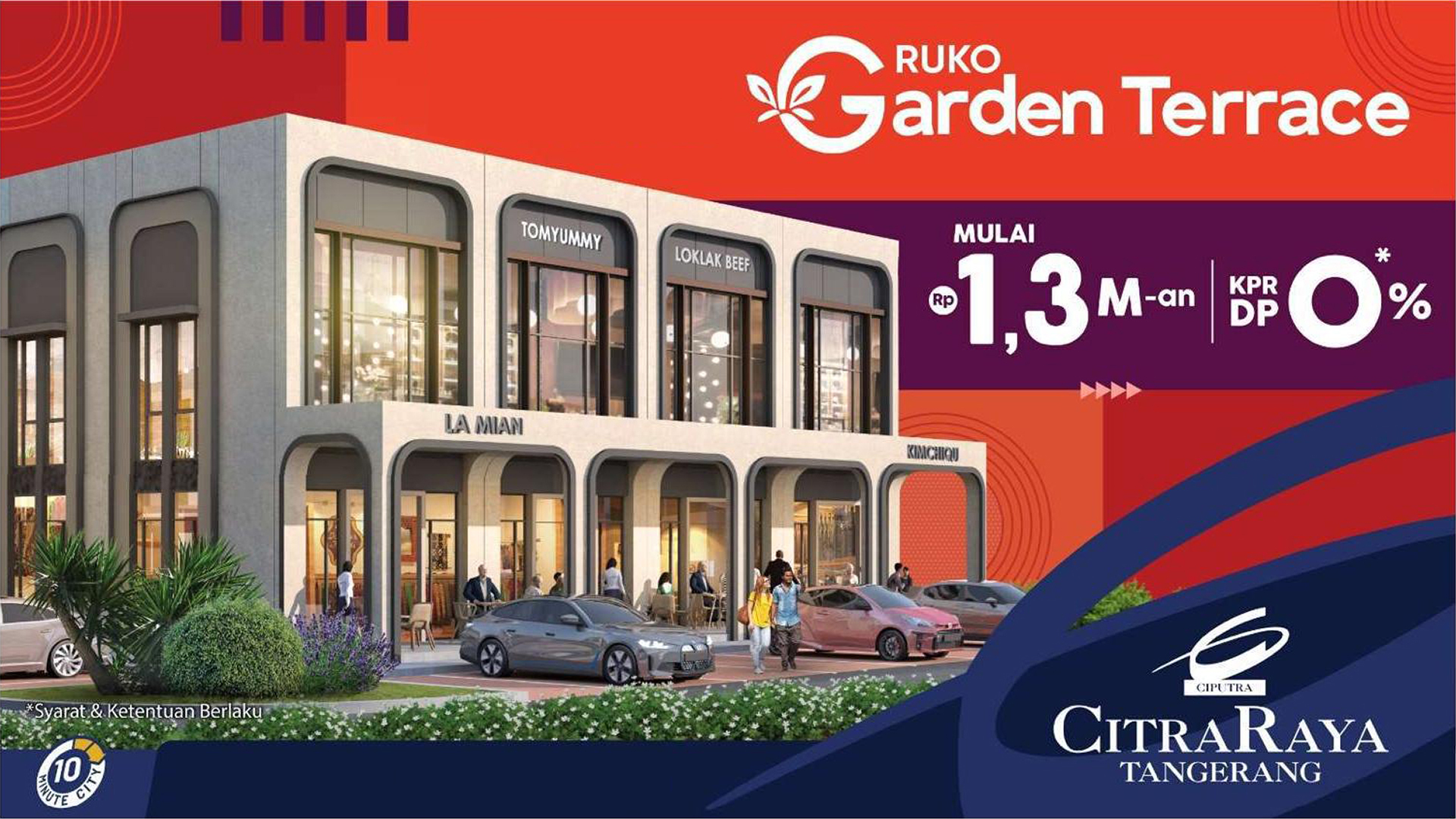 Ruko Garden Terrace adalah area komersial terbaru di kawasan pengembangan Citra Raya Tangerang yang dikembangkan oleh Ciputra Group. Mengusung konsep Alfresco Lifestyle dengan suasana outdoor yang modern dan elegan, ruko ini dirancang untuk mendukung aktivitas usaha seperti restoran, coffee shop, boutique, hingga lifestyle retail. Lokasinya yang strategis berada di pusat kawasan komersial dan dikelilingi oleh fasilitas premium menjadikannya peluang investasi dan usaha yang menjanjikan.